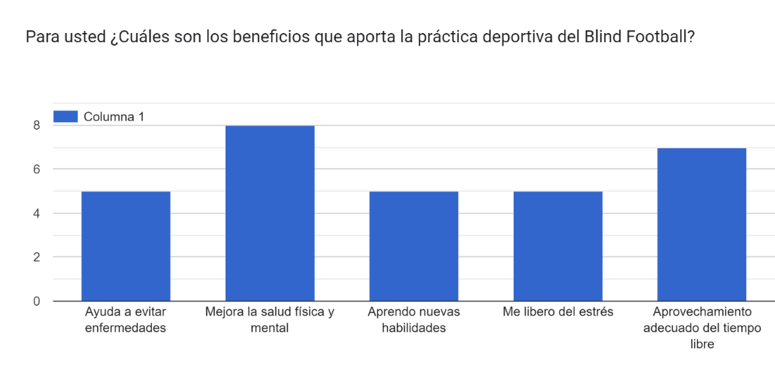 Con el objetivo de evaluar la estrategia pedagógica del Blind Football, analizando su contribución al aprovechamiento del tiempo libre y al mejoramiento de la calidad de vida de las personas con dificultades visuales de la Fundación Nueva Luz, se decidió aplicar una encuesta a la comunidad.[23] Esta encuesta incluyó 11 preguntas: 9 de selección múltiple y 2 de respuesta abierta, y fue aplicada a 10 deportistas con dificultades visuales. A continuación, se presentan los resultados obtenidos.