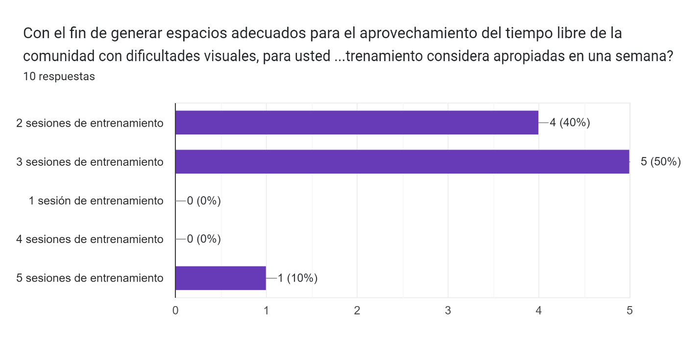 En relación con la pregunta destinada a generar espacios adecuados para el aprovechamiento del tiempo libre de la comunidad con dificultades visuales—“Para usted, ¿cuántas sesiones de entrenamiento considera apropiadas en una semana?”—, el 100% de los encuestados consideró necesario ampliar las sesiones de intervención mediante el Blind Football. De ellos, el 40% expresó que desearía 2 intervenciones por semana, el 50% abogó por 3 sesiones semanales y el 10% propuso 5 entrenamientos por semana.[25] Los participantes destacaron que el tiempo compartido en los entrenamientos es provechoso, ya que no solo les aporta positivamente en su vida diaria, sino que también les permite interactuar y relacionarse con personas en su misma situación, aprender de sus compañeros y sentirse útiles en sus entornos familiar, laboral y comunitario.[26]
