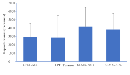 La edad promedio de los jugadores fue 22.5 ± 1.3 años y su experiencia deportiva de 16.2 ± 3.4 años. En la tabla 1 se muestra la estadística descriptiva de cada torneo. En el torneo UPSL-MX, el equipo completó 11 juegos y avanzó hasta la ronda de semifinales. En el torneo LPF, se encontraron nueve videos en redes sociales, aunque el equipo en ese torneo no calificó para jugar en las rondas finales. En el torneo SLMX-2023, el equipo llegó a la ronda de cuartos de final. Finalmente, en el torneo SLMX-2024 se analizaron nueve juegos transmitidos, tanto de local como de visitante. La cantidad de reproducciones por torneo se muestra en la figura 1.